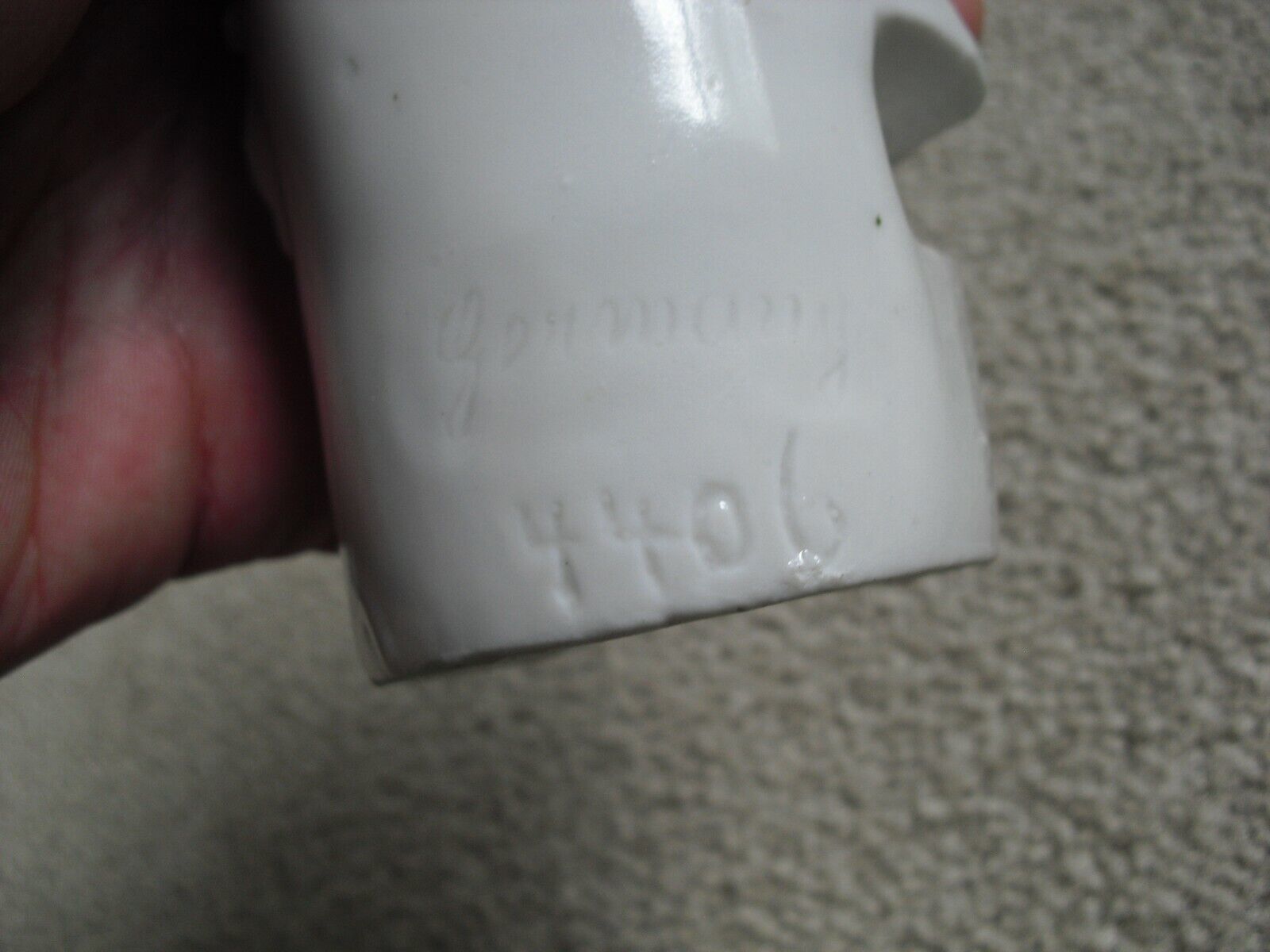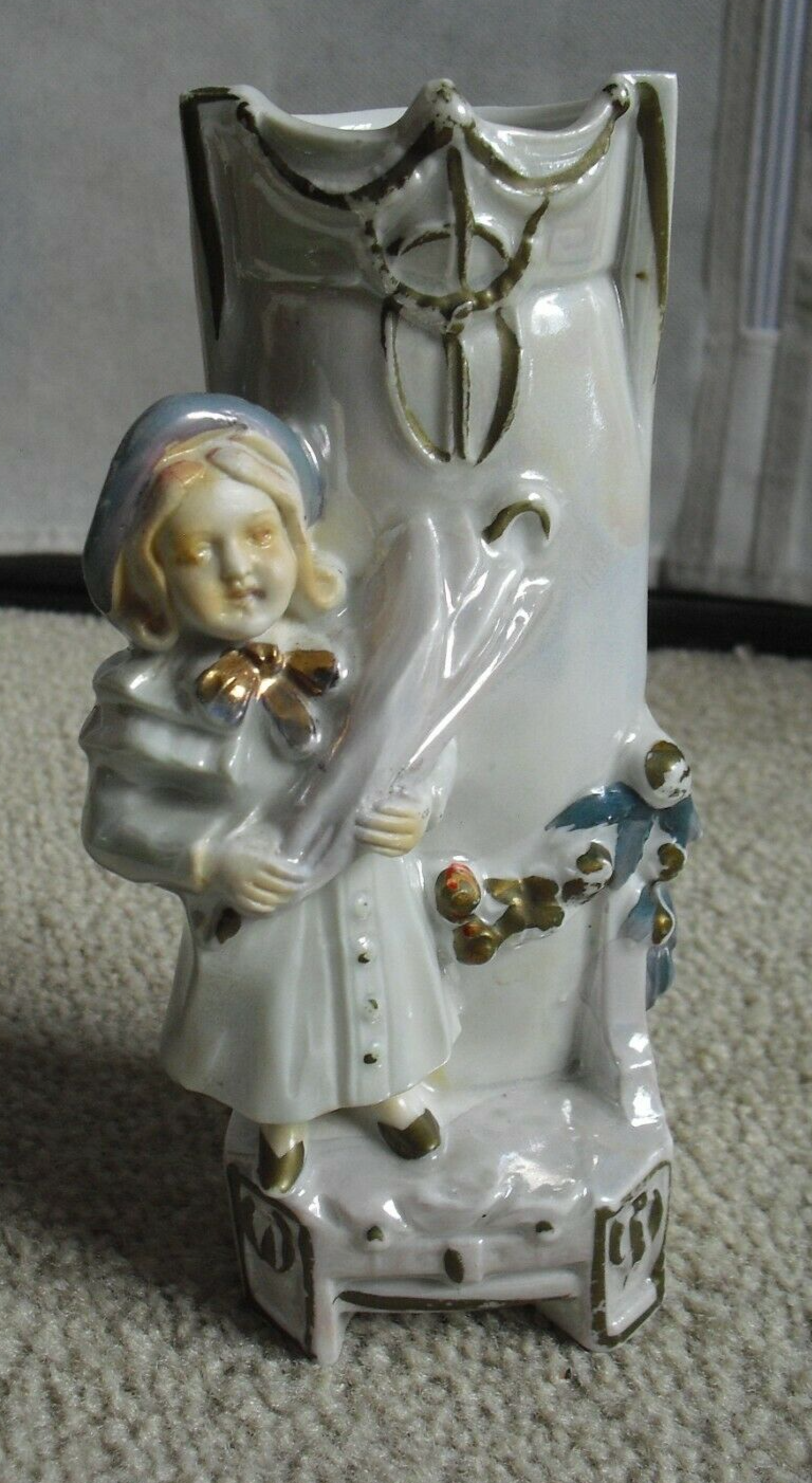 Unique, vintage, Germany 4406 marked lower back, porcelain bisque vase featuring a little girl holding an umbrella. Very nice shape, no cracks or chips, does have wear to the gold painted trim throughout, maybe could use some fine cleaning. Zoom in for details. Circa 1920s-1930s era. About 7 inches tall and 3 1/2 inches wide.