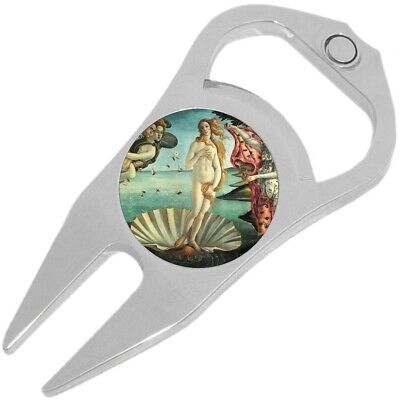 Birth of Venus Golf Ball Marker Divot Repair Tool Bottle Opener. This is an all-in one tool for the golf course. It features a ball marker with a high-quality unique image, a putting green repair tool, and a beer bottle opener. Included is a magnet to secure the ball marker to the tool. This item makes a great gift too!