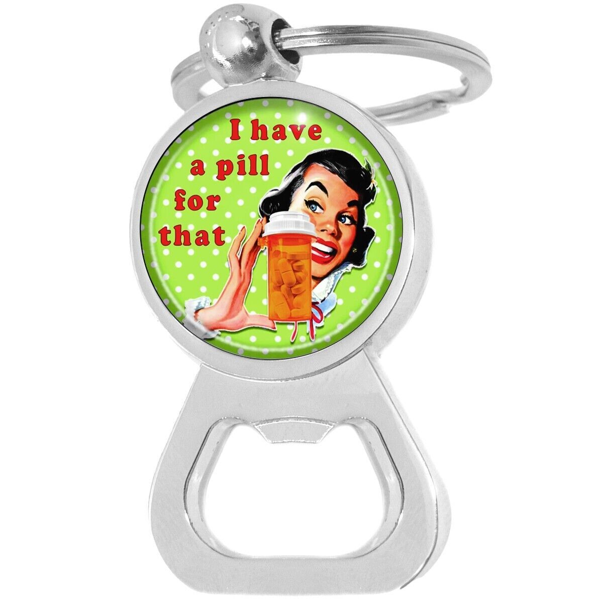 I Have a Pill for That Bottle Opener Keychain. If you want a bottle opener handy this keychain is the perfect solution. Our beautiful keychains are custom made and built to last.