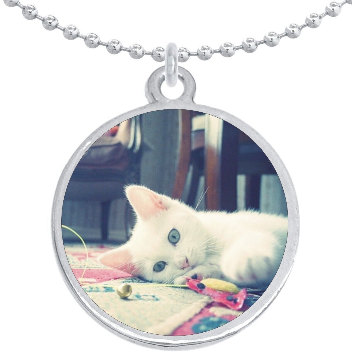 White Cat Round Pendant Necklace. High quality necklace pendant customized here in the USA and shipped quickly to you.