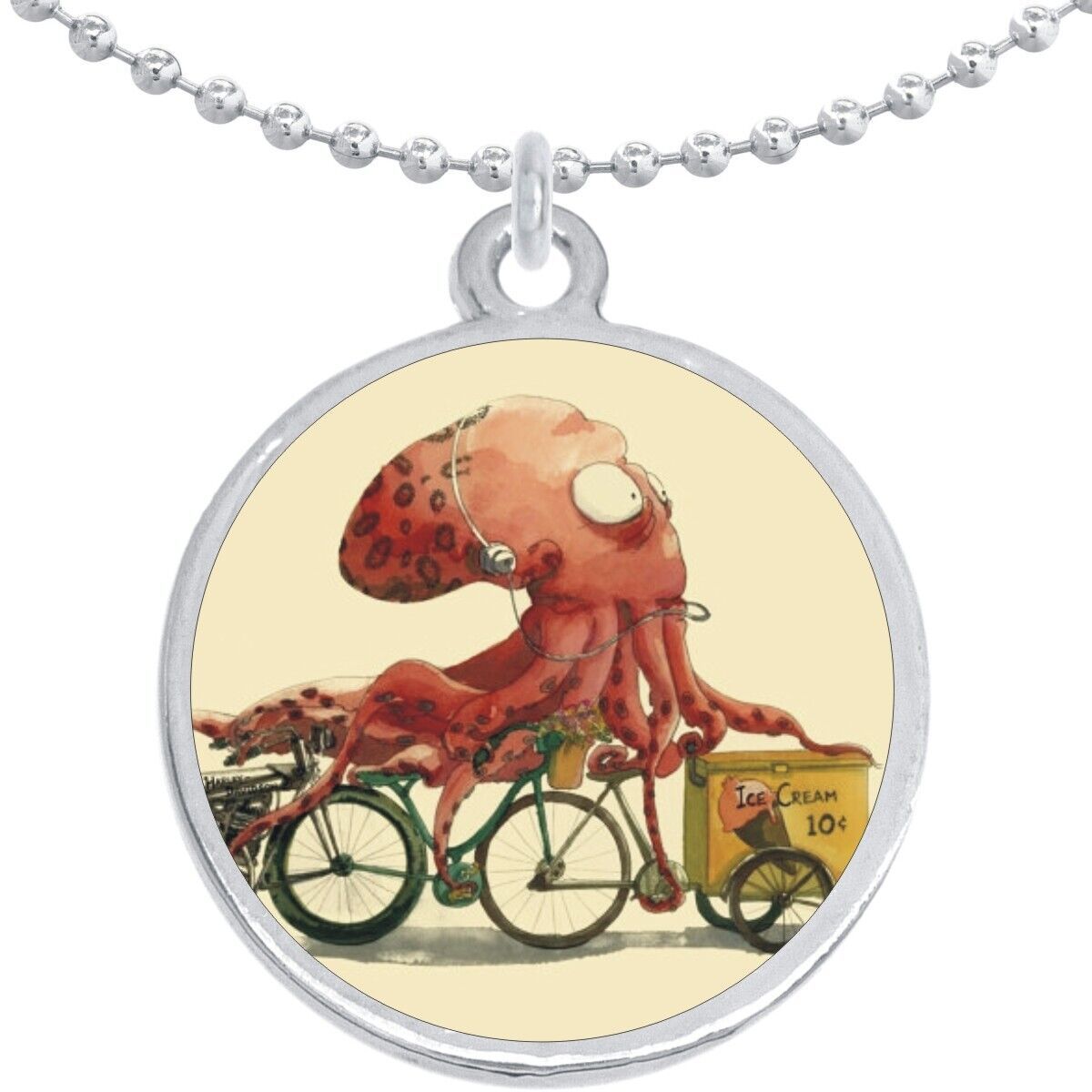 Octopus Bicycle Funny Round Pendant Necklace. High quality necklace pendant customized here in the USA and shipped quickly to you.