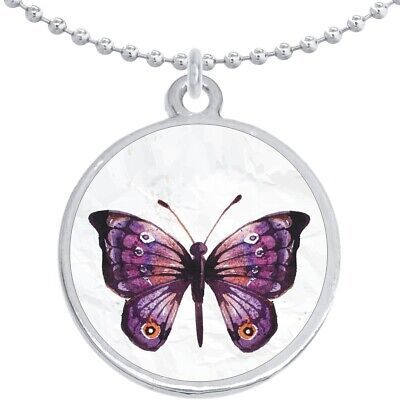 Purple Butterfly on Grey Round Pendant Necklace Beautiful Fashion Jewelry