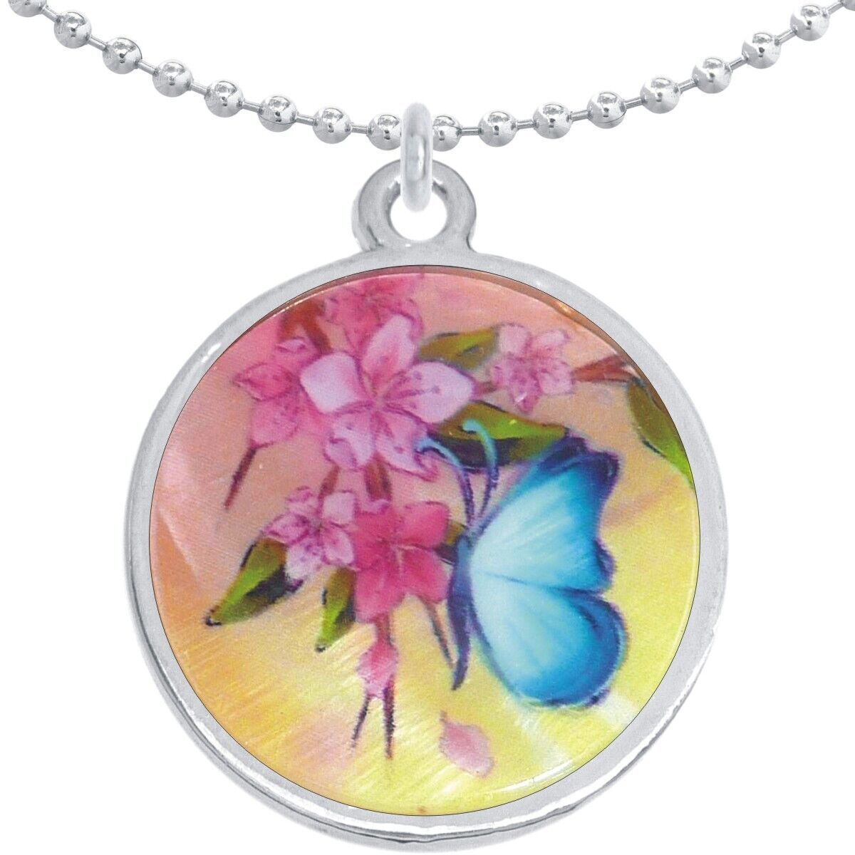 Blue Butterfly on Flower Round Pendant Necklace Beautiful Fashion Jewelry