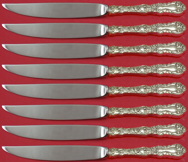 Sterling Silver hollow handle Set of 8 Steak Knives 8" with stainless not-serrated blade in the pattern Imperial Chrysanthemum By Gorham. It is not monogrammed and is in excellent condition.