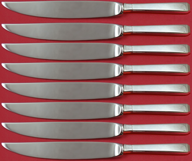 Sterling Silver hollow handle Set of 8 Steak Knives 8" with stainless not-serrated blade in the pattern Craftsman By Towle. It is not monogrammed and is in excellent condition.