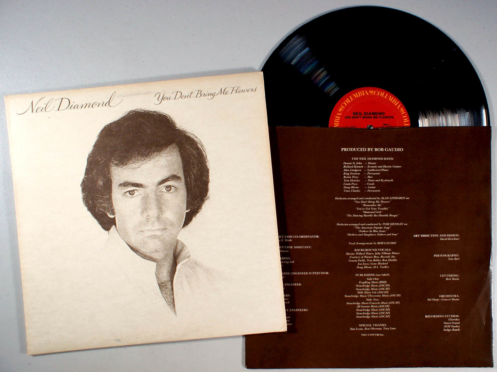You Don't Bring Me Flowers, by Neil Diamond, was released to capitalize on the success of the title song, a duet with Barbra Streisand. A reviewer on allmusic.com says of the album "Sung with passion and grace, this is Neil Diamond during his peak, and merits a listen for all late-'70s enthusiasts."