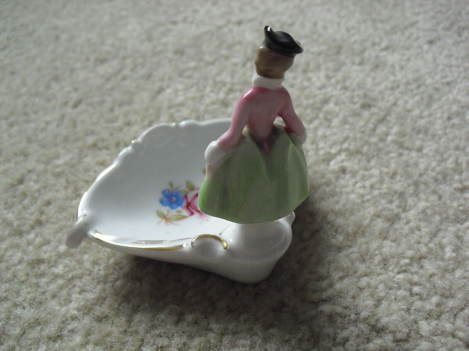 You are bidding on a unique, silver stamped Erphila Germany marked with some letters underneath the Germany that I cannot make out, figural ashtray or small trinket tray or little holy water dish, in the picture. Features a unique Victorian woman with green dress and pink blouse and flowers on the inside of the dish. Very unique piece in great shape with no damage. About 3 1/2 inches tall and 4 inches wide. Circa 1930s era piece.