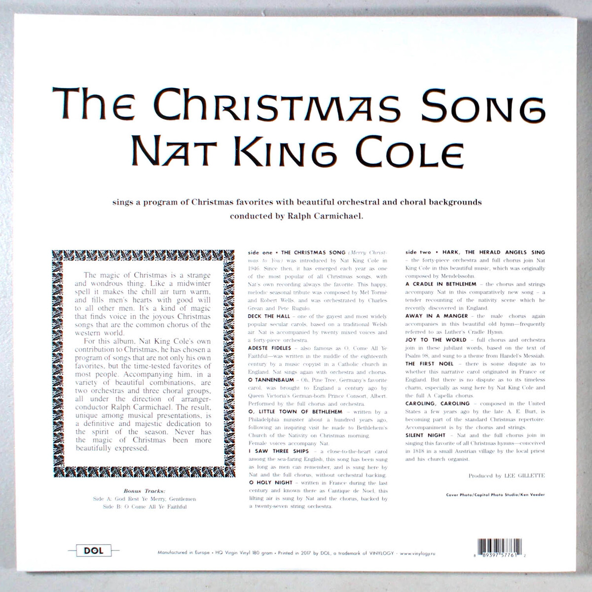For this album, Nat King Cole's own contribution to Christmas, he has chosen a program of songs that are not only his own favorites, but the time-tested favorites of most people. Accompanying him, in a variety of beautiful combinations, are two orchestras and three choral groups, all under the direction of arranger-conductor Ralph Carmichael. The result, unique among musical presentations, is a definitive and majestic dedication to the spirit of the season. Never has the magic of Christmas been more beautifully expressed.