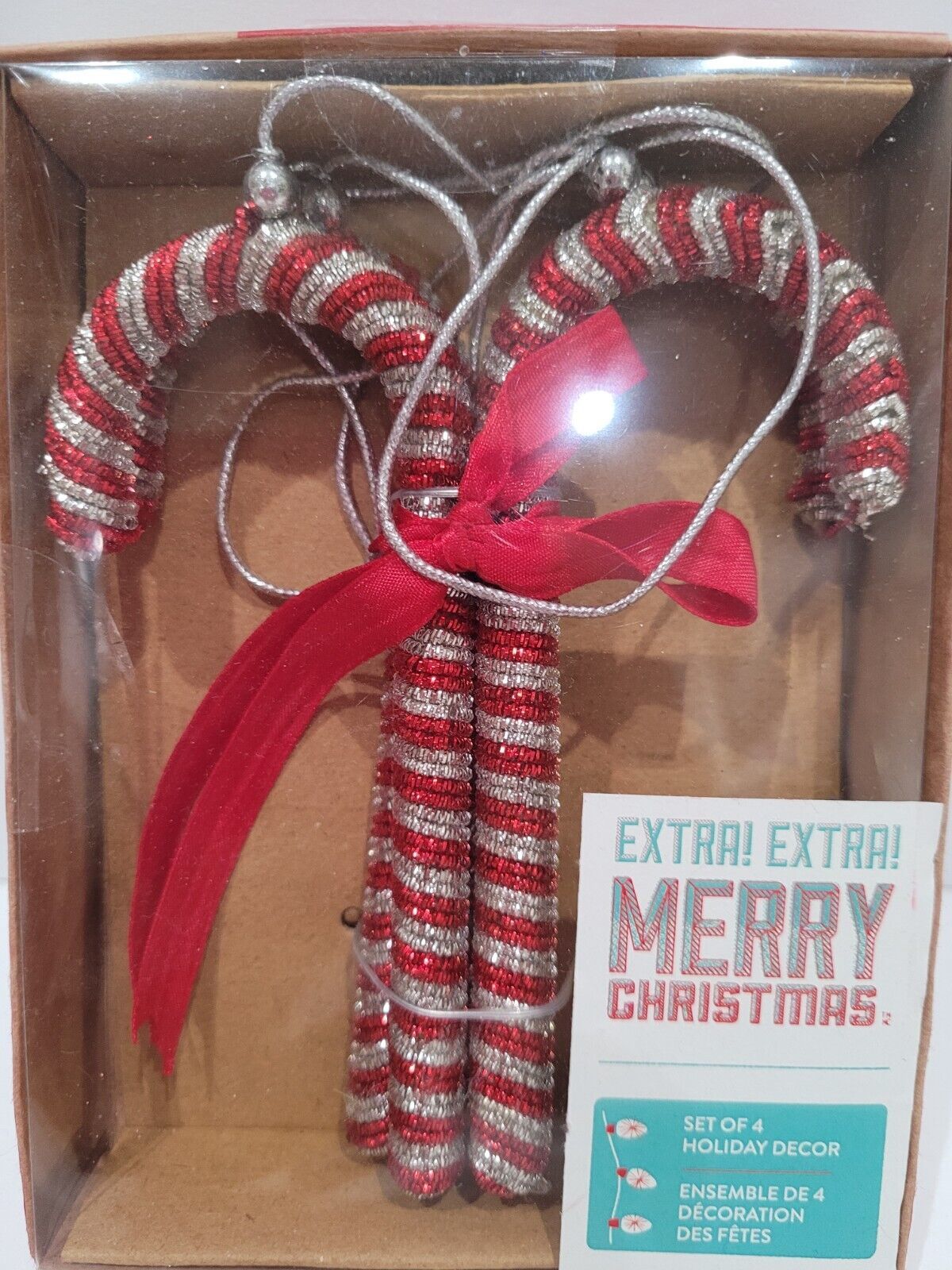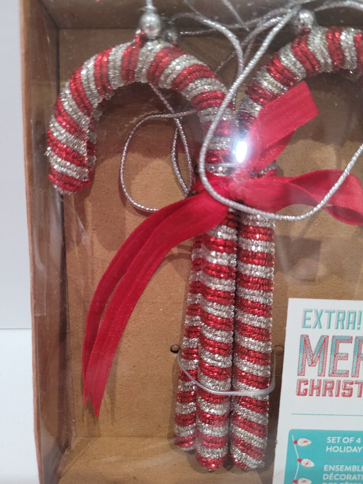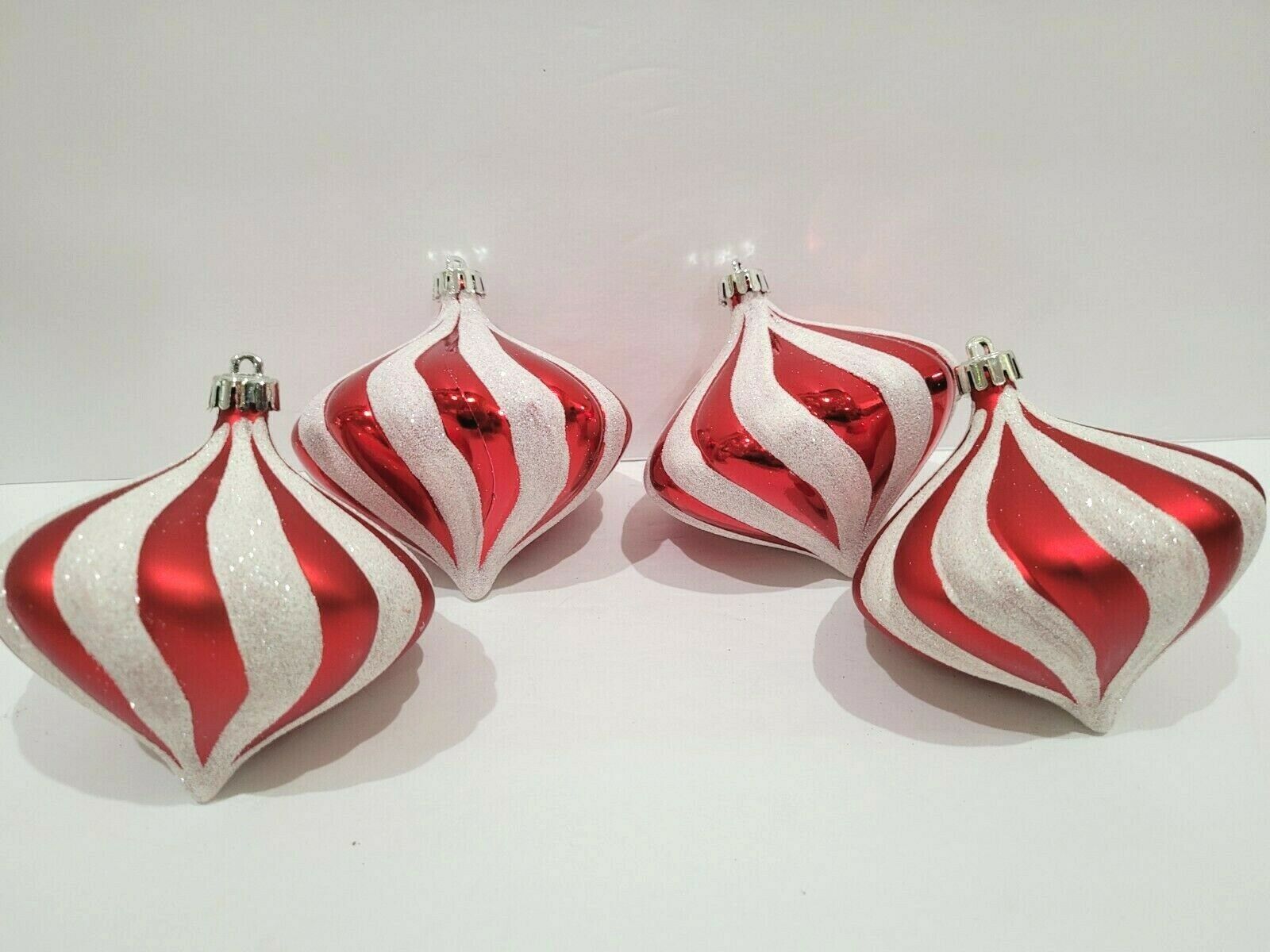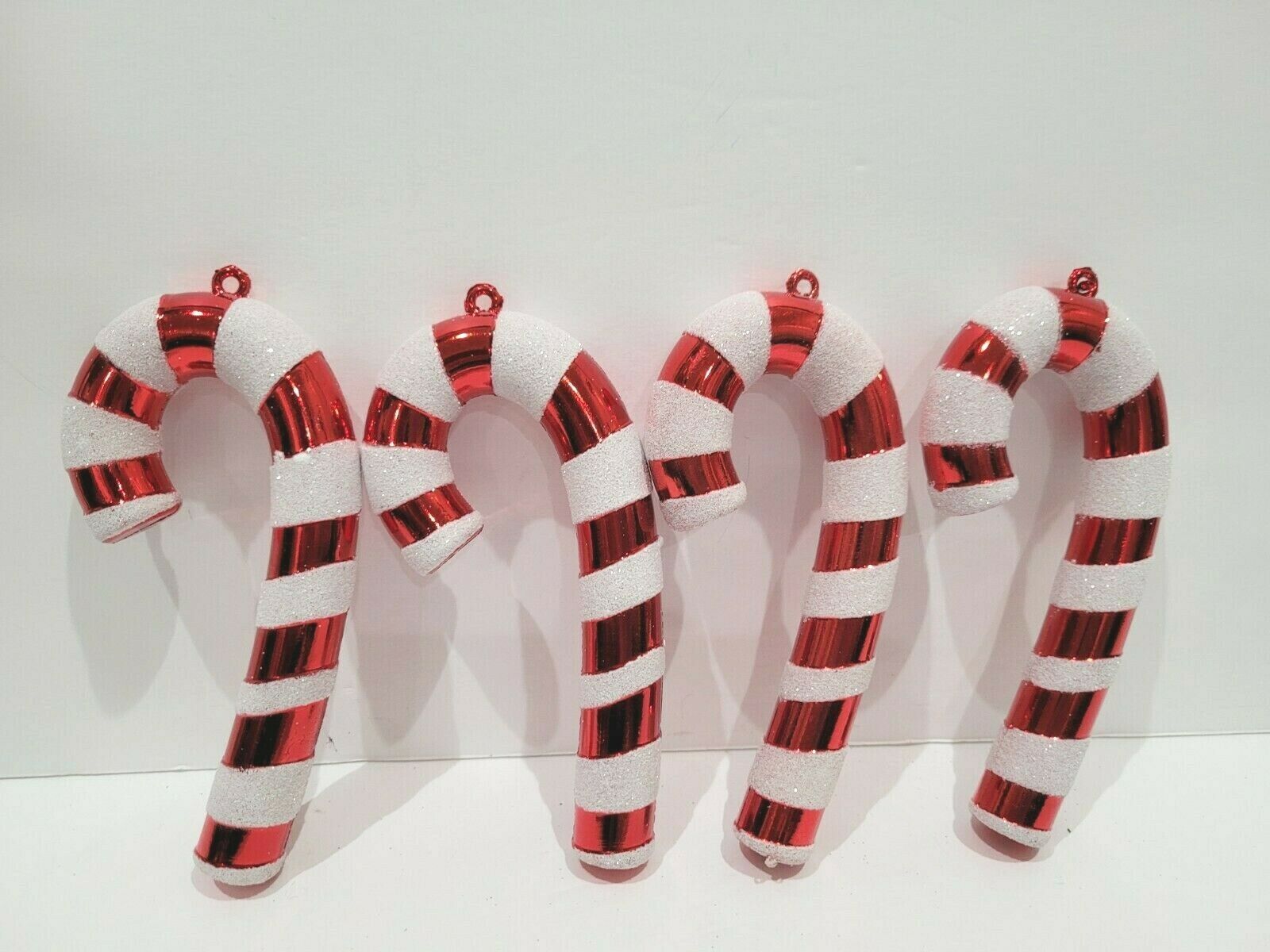 Listing is for candy cane ornaments only. Up for sale we have these adorable plastic candy cane ornaments. The ornaments are plastic and are wrapped in silver red glitter ribbon/thread. These will look amazing on a tree, wreath or garland. Measure approx 5.25" including tip. Set of 4. I have many more matching ornaments see the last few pictures for just some of the items available.