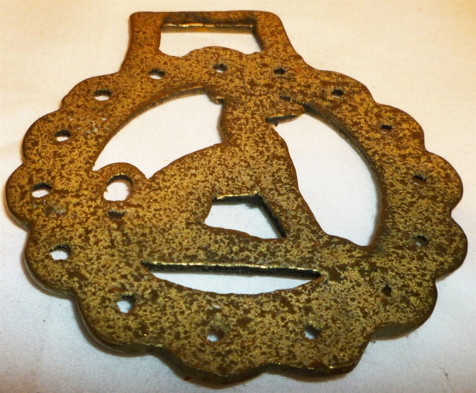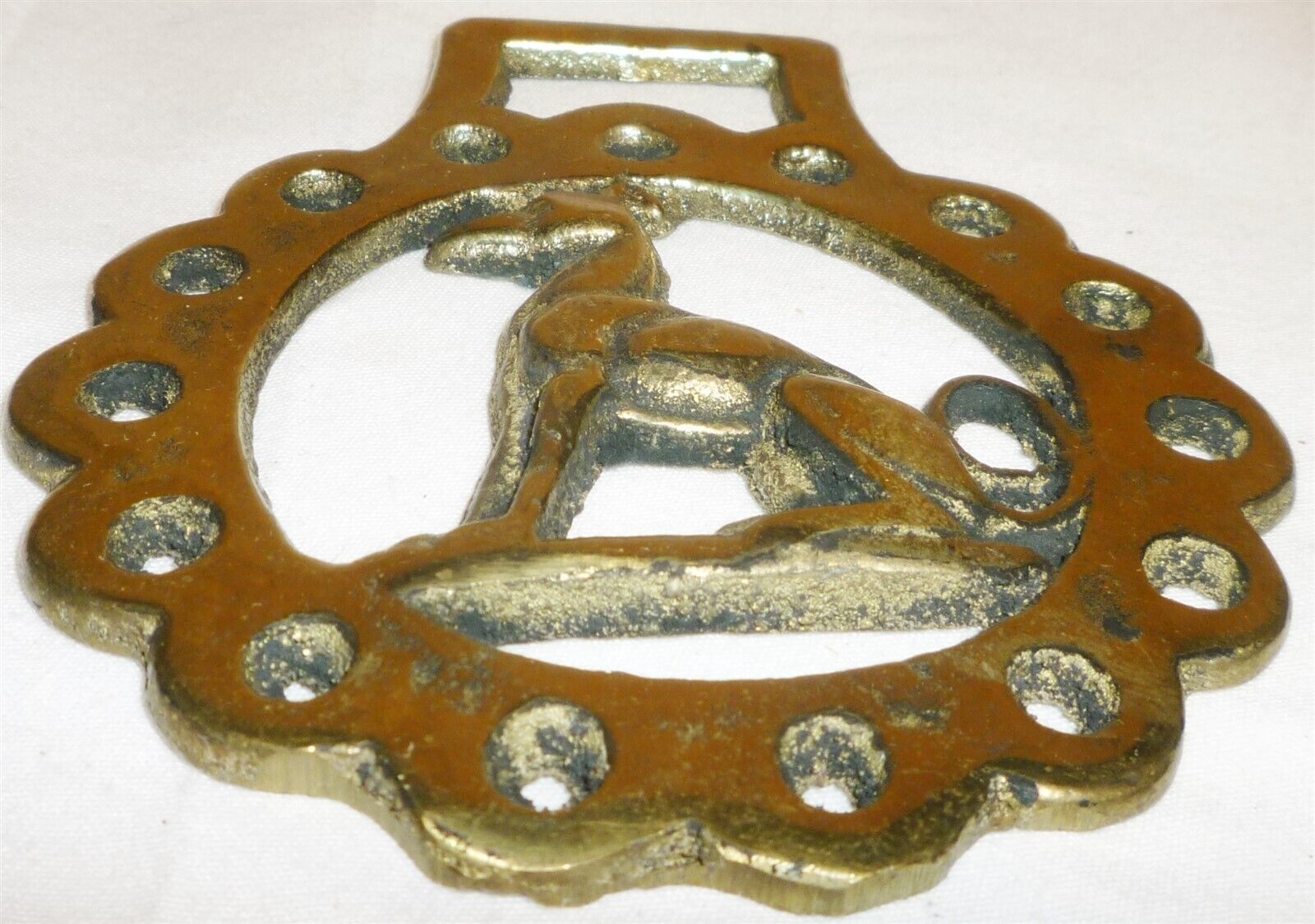 VINTAGE SOLID BRASS HORSE SADDLE HARNESS BRASS MEDALLION GREYHOUND DOG