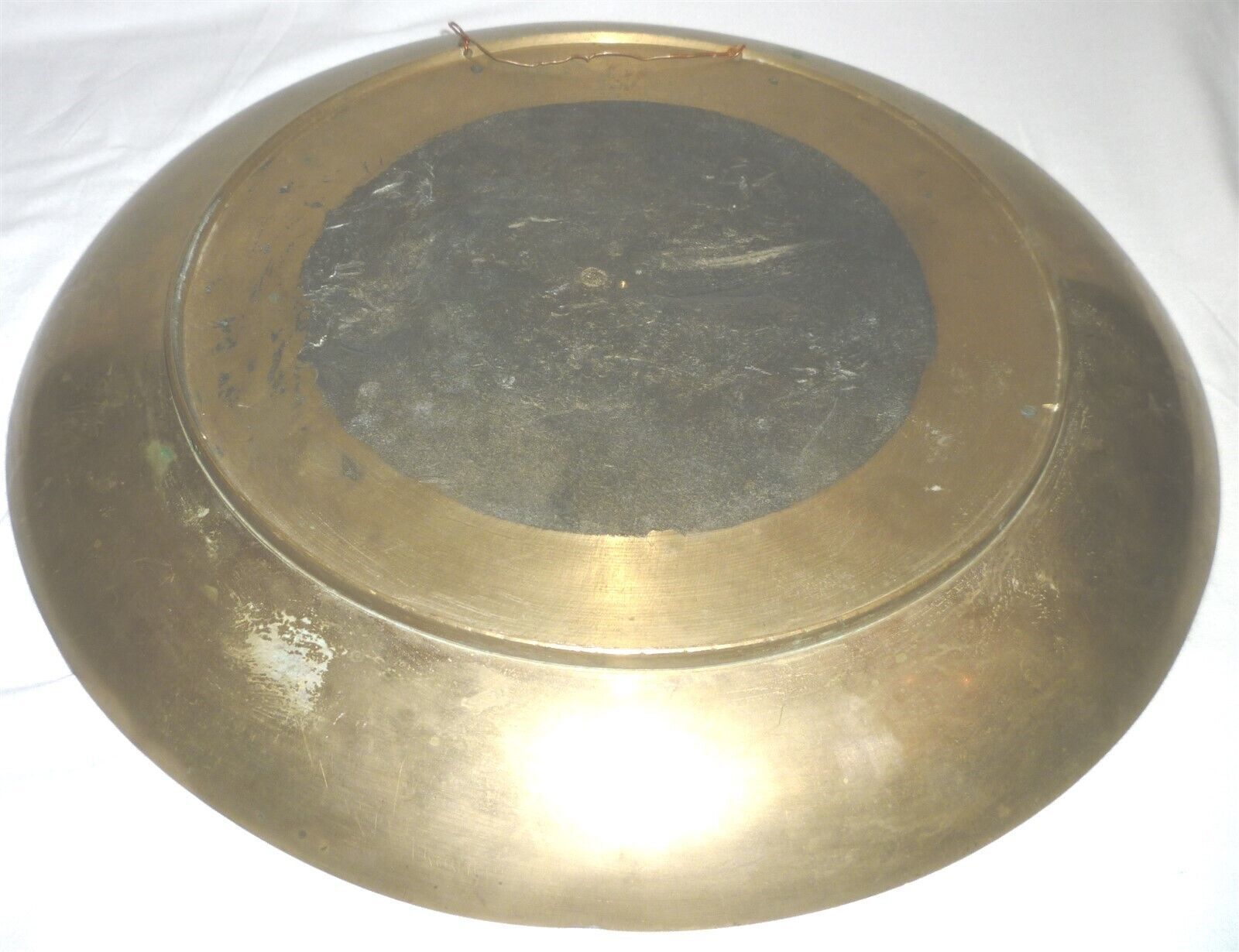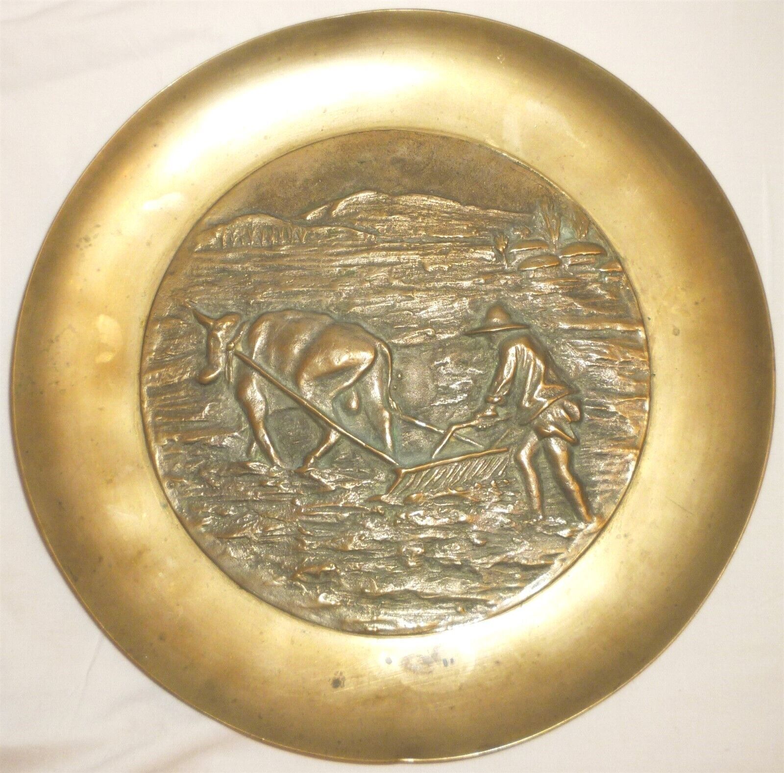 VINTAGE BRONZE BRASS HEAVY EMBOSSED DECORATIVE PLATE FARMER PLOWING W/OXEN