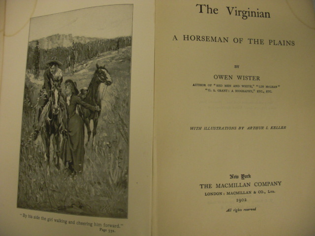 The Virginian (otherwise titled The Virginian: A Horseman of the Plains) is a 1902 novel by the American author Owen Wister (1860-1938), set in Wyoming Territory during the 1880s. It describes the life of a cowboy on a cattle ranch and is considered the first true fictional western ever written, aside from short stories and pulp dime novels, though modern scholars debate this. The Virginian paved the way for many more westerns by such authors as Zane Grey, Louis L'Amour and several others. The novel was adapted from several short stories published in Harper's Magazine and the Saturday Evening Post between Nov 1893 and May 1902.