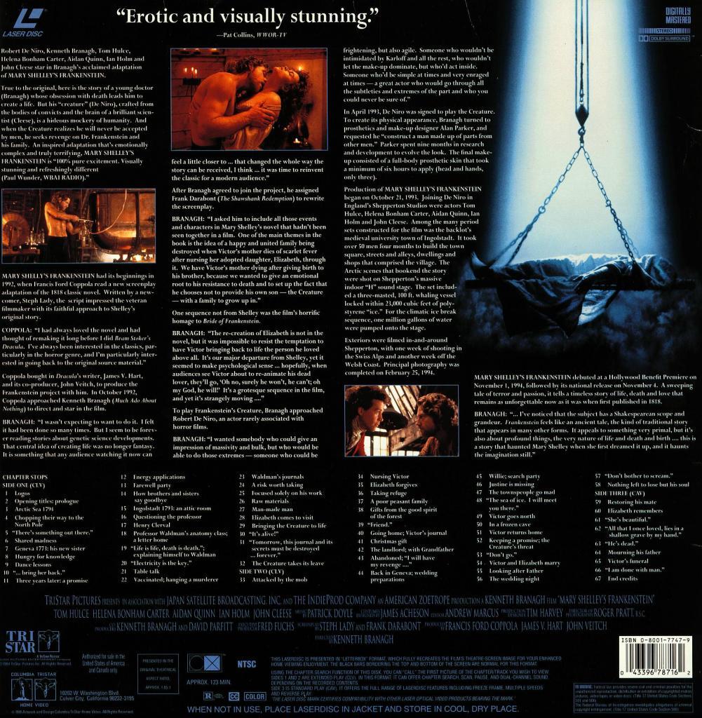 MARY SHELLEY'S FRANKENSTEIN HELENA BONHAM CARTER LASERDISC RARE