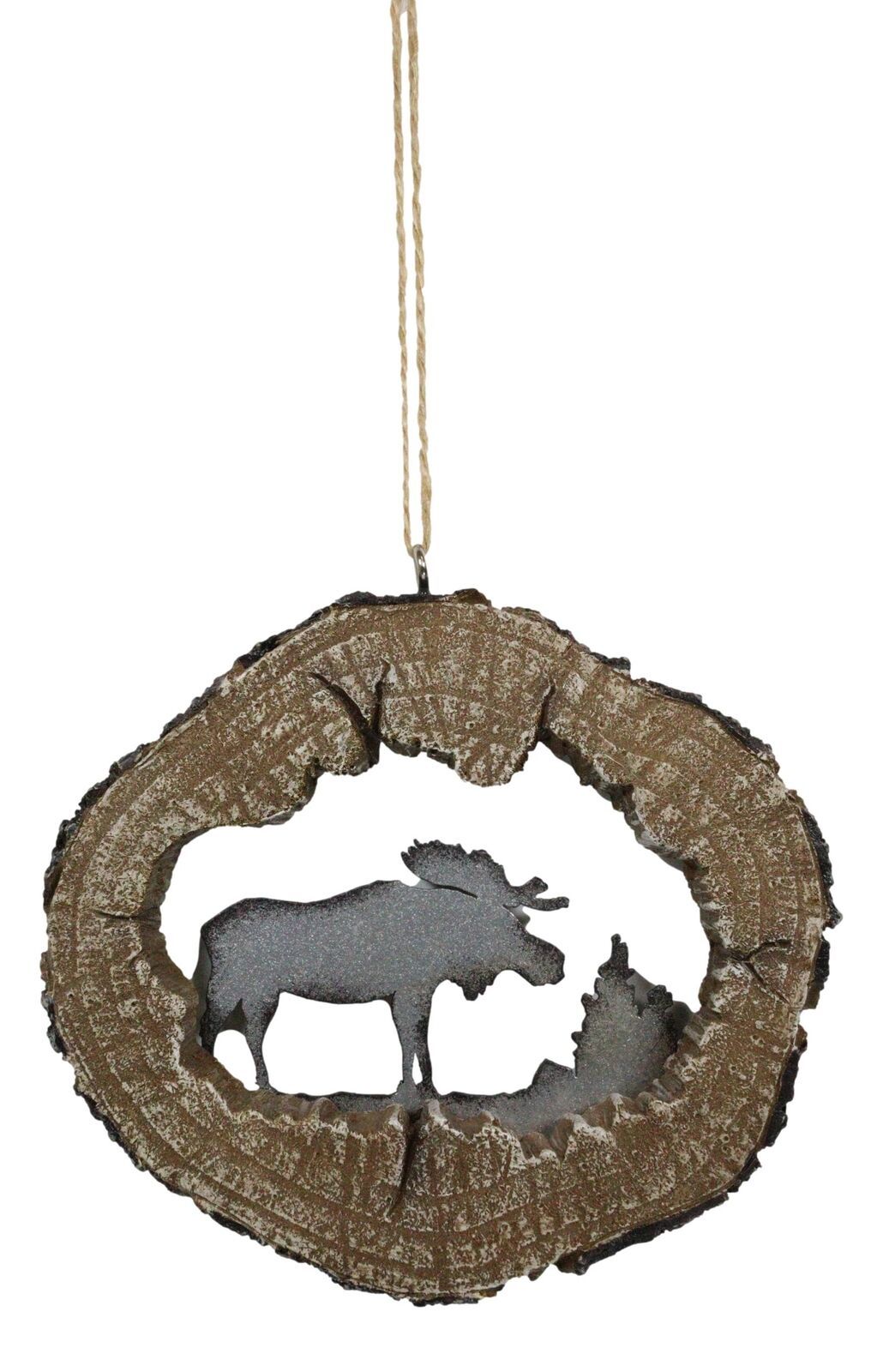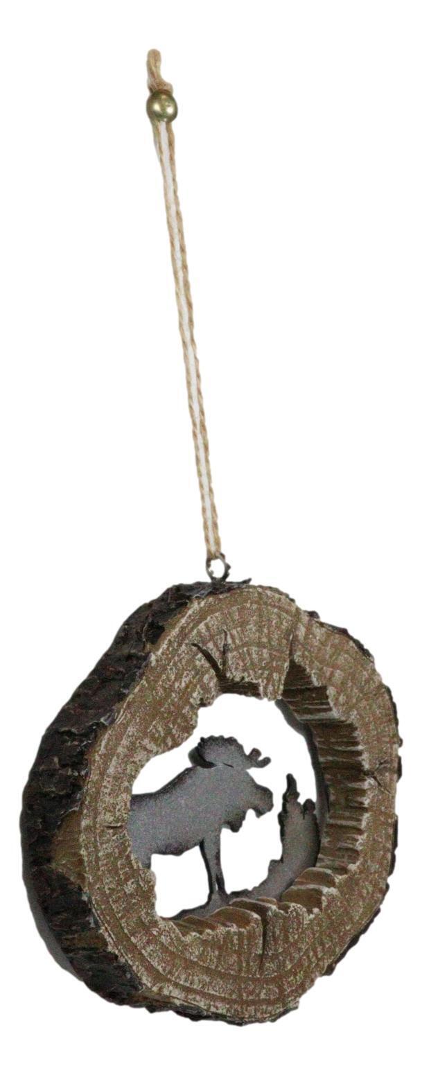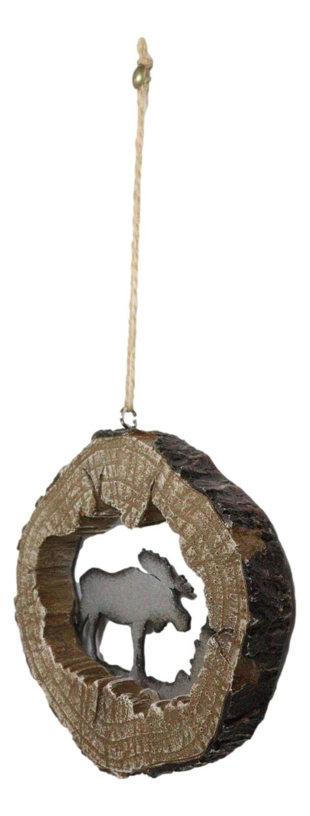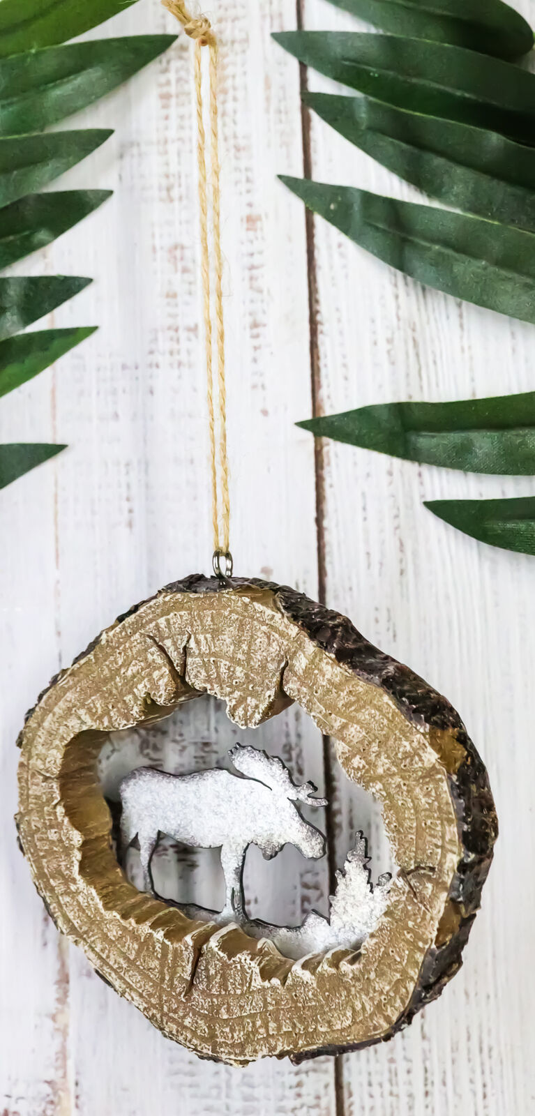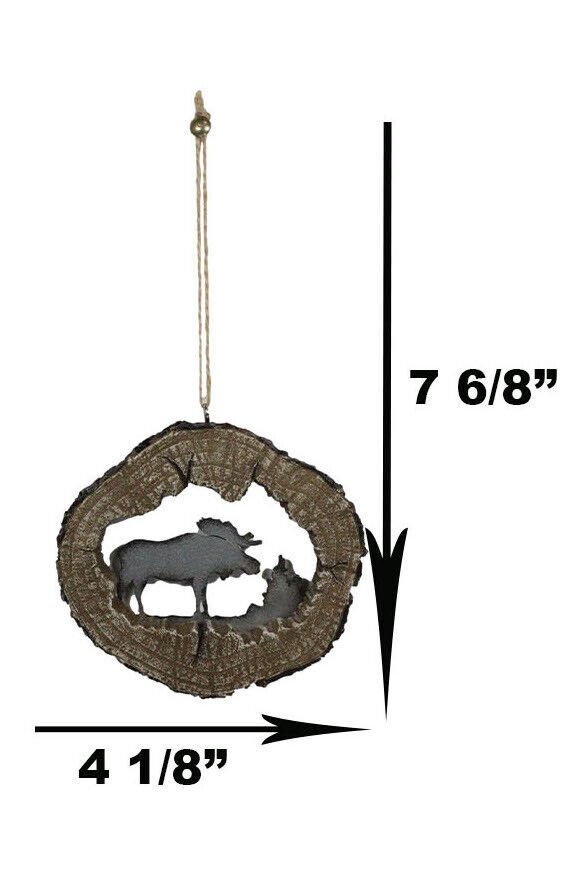 โข Each Of These Rustic Wildlife Tree Ring Ornament Sculptures measures 4.25" Wide, 0.5" Thick and 3.5" High. The string hangs down 4" from the hanging hook/tree twig.