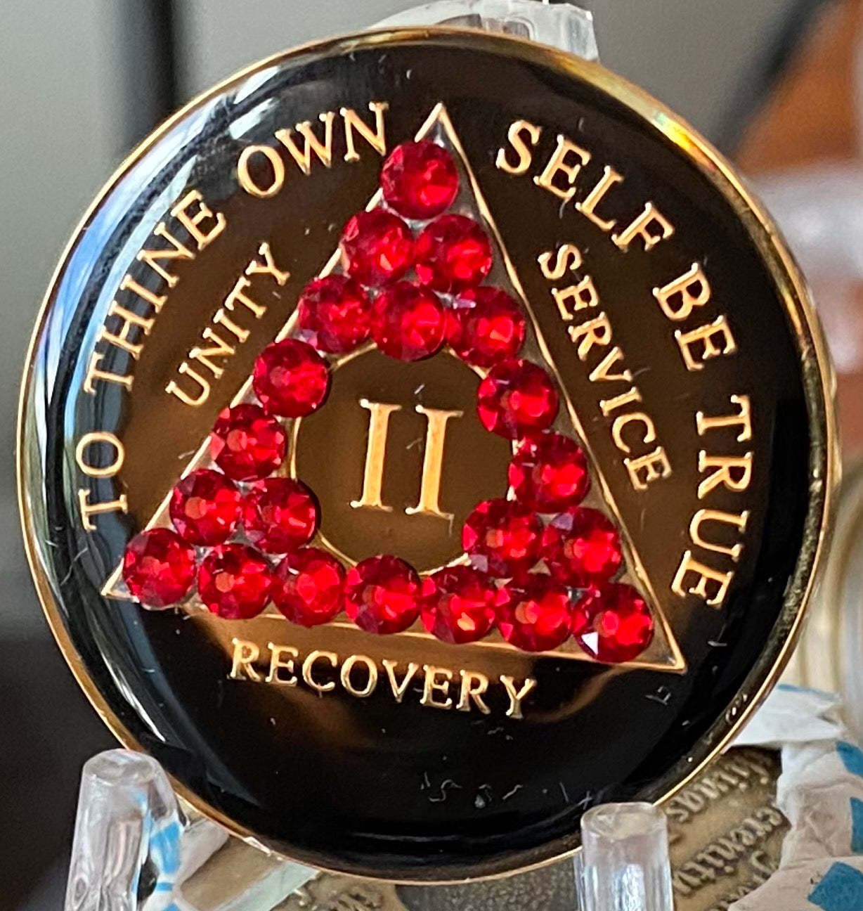 2 Year AA Medallion Black Siam Red Crystal Sobriety Chip