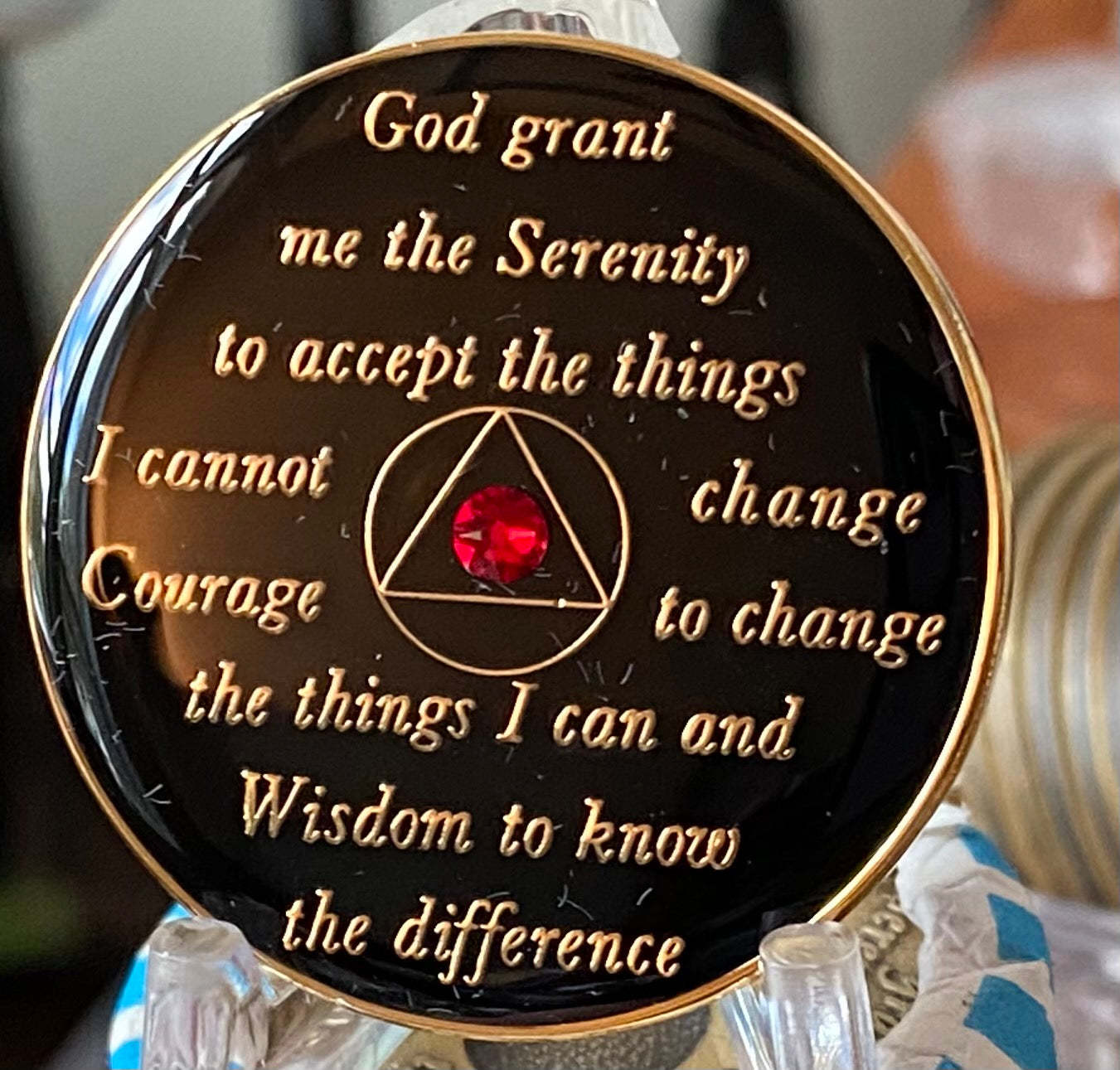Black Tri-plate Sobriety Chip with red Siam color Swarovski Crystals installed by persons in recovery.