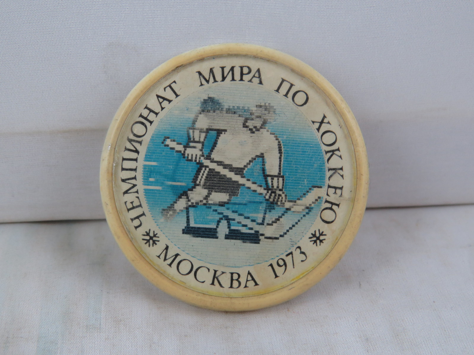 Up for sale is a vintage hockey pin. It is for the 1973 World Hockey Championships which were held in Moscow. The pin is a hologram-changing graphic pin. One graphic on the pin is the official bear mascot for the event, while the other graphic is of a hockey player. The outer graphic on the pin is World Hockey Championships Moscow 1973. What a great addition to any pin collection.
