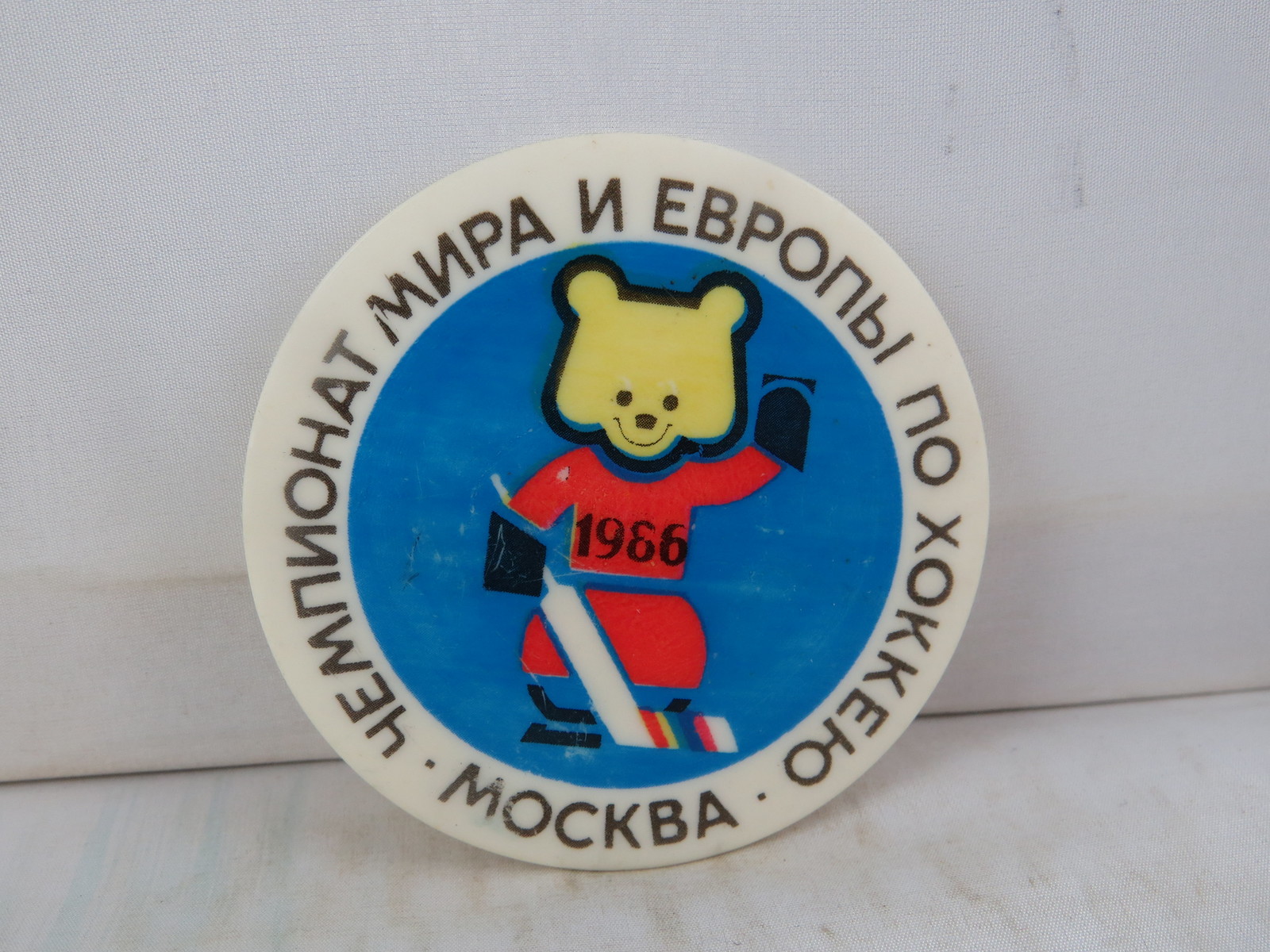 Up for sale is a vintage hockey pin. It is a celluloid pin from the 1986 World Hockey Championships which were held in Moscow. The outer ring of the pin has World Hockey Championships Moscow is screened on in black. The middle of the pin has a graphic of a bear goalie on blue background. What a great addition to any pin collection.