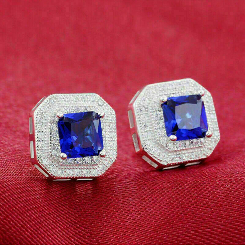 3Ct Princess Cut Blue Tanzanite Double Halo Stud Earrings 14K White Gold Finish