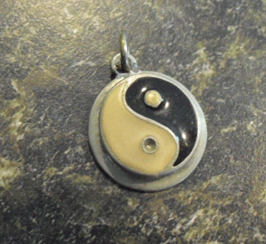 You are bidding on a cool, circa 1970s era, hard to tell, looks older, silver tone metal with enameled Yin Yang design on front, pendant or charm in the picture. 7/8 inches wide. Nice shape with very some light use, could use a polishing. Zoom in for condition.