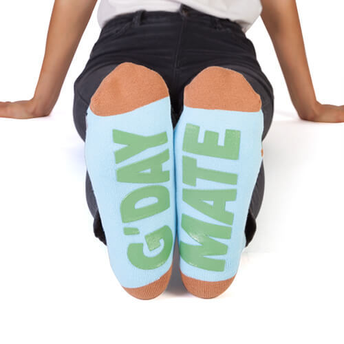 Koalas and eucalypt leaves on the top, G'DAY MATE on the bottom Great as a souvenir, or for Aussie animal lovers Feet Speak are socks with great soles!