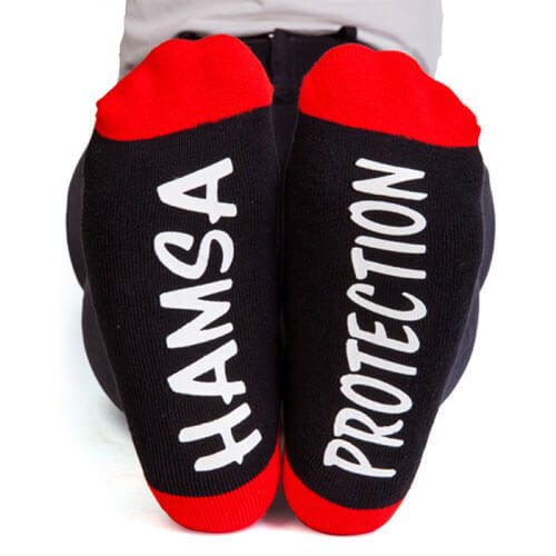 Black socks featuring vibrant red, yellow, purple green Hamsa designs. Anti-slip words on the bottom say TALK TO THE HAMSA. One size fits most.