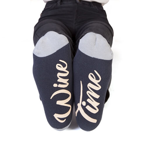 Socks with great soles! Features illustrations of wine glasses and grapes on top And WINE TIME on the bottom