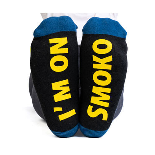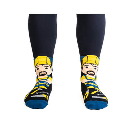 Socks that make a statement! Black and blue socks featuring a tradie wearing a yellow hard ha
