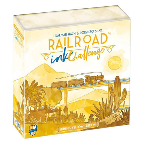 Railroad Ink Challenge Shining Yellow. Quick-playing roll-and-write gameplay for 1-6. Includes the Rivers and Lakes expansions. Combine with Blazing Red version to play up to 12. Contains 6 Boards, 4 Route dice, 2 River dice, 2 Lake dice, 6 Markers, and 1 Rulebook.
