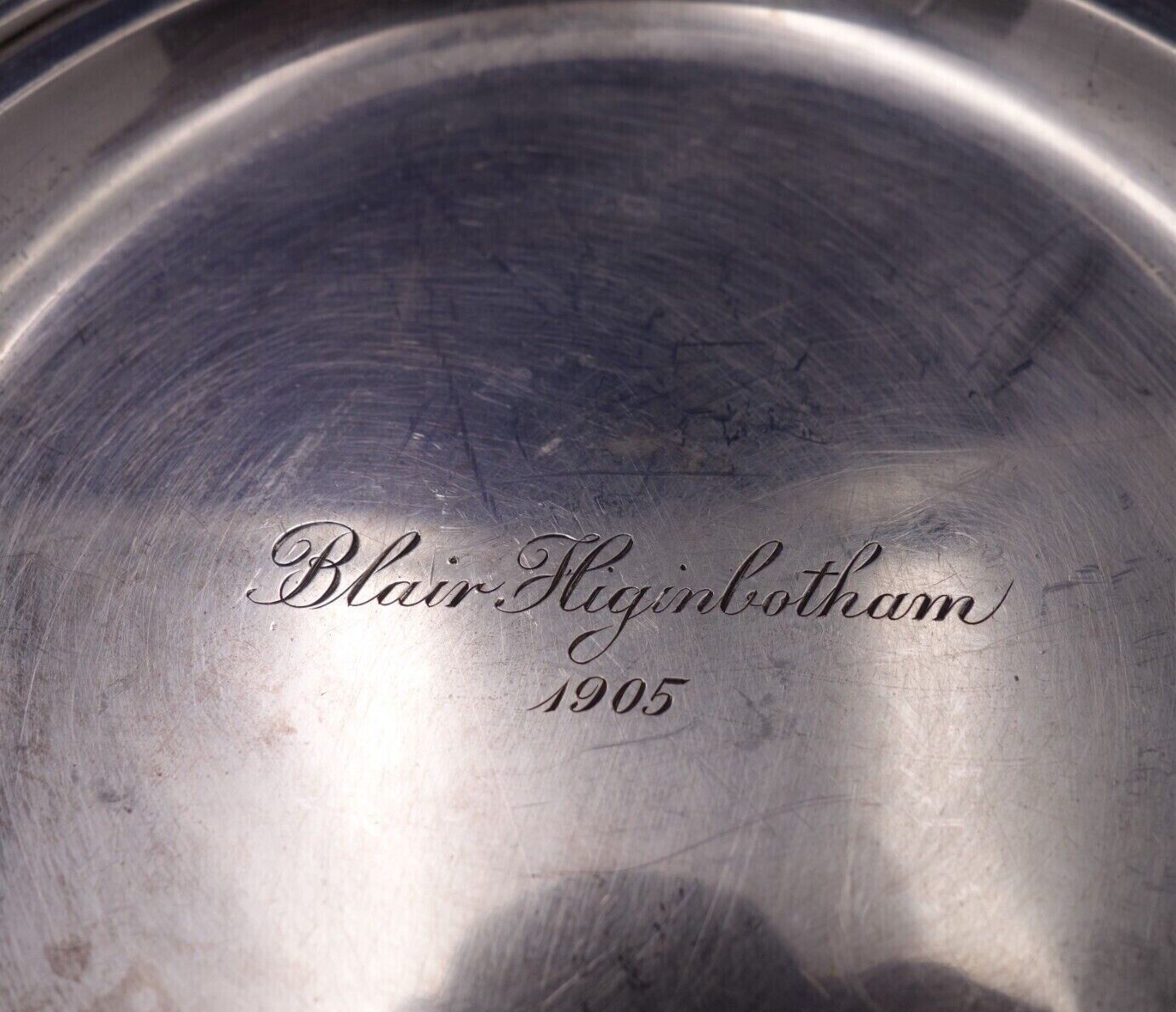 Together the pieces weigh 12.7 troy ounces. They have a name/date engraving, "Blair Higinbotham 1905" (see photos), and are in good vintage condition. Adorable!