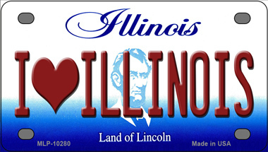 I Love Illinois Novelty Mini Metal License Plate Tag. 2.2" x 4" high gloss novelty mini metal license plate tag. Made of the highest quality aluminum for a weather resistant finish. It is lightweight and durable. Pre-drilled holes for quick and easy mounting on any vehicle, or add a ribbon, wire or string to instantly turn this license plate into a sign and display it on a wall or door. Individually shrink-wrapped and proudly made in the USA.