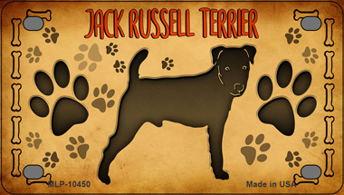 Jack Russell Terrier Novelty Mini Metal License Plate Tag. 2.2" x 4" high gloss novelty mini metal license plate tag. Made of the highest quality aluminum for a weather resistant finish. It is lightweight and durable. Pre-drilled holes for quick and easy mounting on any vehicle, or add a ribbon, wire or string to instantly turn this license plate into a sign and display it on a wall or door. Individually shrink-wrapped and proudly made in the USA.