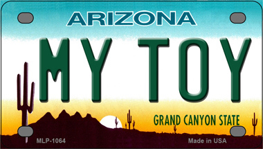 My Toy Arizona Novelty Mini Metal License Plate Tag. 2.2" x 4" high gloss novelty mini metal license plate tag. Made of the highest quality aluminum for a weather resistant finish. It is lightweight and durable. Pre-drilled holes for quick and easy mounting on any vehicle, or add a ribbon, wire or string to instantly turn this license plate into a sign and display it on a wall or door. Individually shrink-wrapped and proudly made in the USA.
