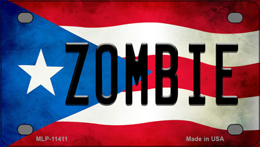 Zombie Puerto Rico Flag Novelty Mini Metal License Plate Tag. 2.2" x 4" high gloss novelty mini metal license plate tag. Made of the highest quality aluminum for a weather resistant finish. It is lightweight and durable. Pre-drilled holes for quick and easy mounting on any vehicle, or add a ribbon, wire or string to instantly turn this license plate into a sign and display it on a wall or door. Individually shrink-wrapped and proudly made in the USA.