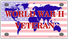 WW II Veteran Novelty Mini Metal License Plate Tag. 2.2" x 4" high gloss novelty mini metal license plate tag. Made of the highest quality aluminum for a weather resistant finish. It is lightweight and durable. Pre-drilled holes for quick and easy mounting on any vehicle, or add a ribbon, wire or string to instantly turn this license plate into a sign and display it on a wall or door. Individually shrink-wrapped and proudly made in the USA.