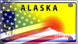 Alaska with American Flag Novelty Mini Metal License Plate Tag. 2.2" x 4" high gloss novelty mini metal license plate tag. Made of the highest quality aluminum for a weather resistant finish. It is lightweight and durable. Pre-drilled holes for quick and easy mounting on any vehicle, or add a ribbon, wire or string to instantly turn this license plate into a sign and display it on a wall or door. Individually shrink-wrapped and proudly made in the USA.