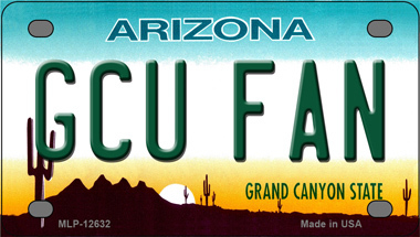 Grand Canyon Univ Fan Arizona Novelty Mini Metal License Plate Tag. 2.2" x 4" high gloss novelty mini metal license plate tag. Made of the highest quality aluminum for a weather resistant finish. It is lightweight and durable. Pre-drilled holes for quick and easy mounting on any vehicle, or add a ribbon, wire or string to instantly turn this license plate into a sign and display it on a wall or door. Individually shrink-wrapped and proudly made in the USA.