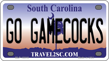 Go Gamecocks South Carolina Novelty Mini Metal License Plate Tag. 2.2" x 4" high gloss novelty mini metal license plate tag. Made of the highest quality aluminum for a weather resistant finish. It is lightweight and durable. Pre-drilled holes for quick and easy mounting on any vehicle, or add a ribbon, wire or string to instantly turn this license plate into a sign and display it on a wall or door. Individually shrink-wrapped and proudly made in the USA.