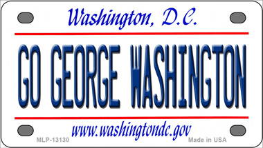 Go George Washington Novelty Mini Metal License Plate Tag. 2.2" x 4" high gloss novelty mini metal license plate tag. Made of the highest quality aluminum for a weather resistant finish. It is lightweight and durable. Pre-drilled holes for quick and easy mounting on any vehicle, or add a ribbon, wire or string to instantly turn this license plate into a sign and display it on a wall or door. Individually shrink-wrapped and proudly made in the USA.
