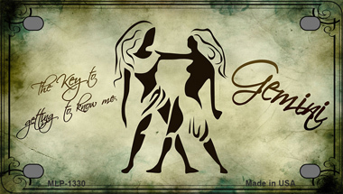 Gemini Zodiac Novelty Mini Metal License Plate Tag. 2.2" x 4" high gloss novelty mini metal license plate tag. Made of the highest quality aluminum for a weather resistant finish. It is lightweight and durable. Pre-drilled holes for quick and easy mounting on any vehicle, or add a ribbon, wire or string to instantly turn this license plate into a sign and display it on a wall or door. Individually shrink-wrapped and proudly made in the USA.