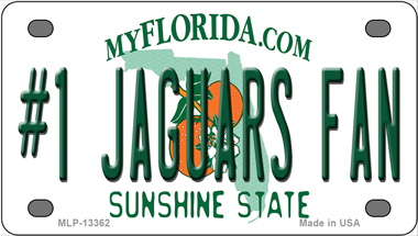Number 1 Jaguars Fan Florida Novelty Mini Metal License Plate Tag. 2.2" x 4" high gloss novelty mini metal license plate tag. Made of the highest quality aluminum for a weather resistant finish. It is lightweight and durable. Pre-drilled holes for quick and easy mounting on any vehicle, or add a ribbon, wire or string to instantly turn this license plate into a sign and display it on a wall or door. Individually shrink-wrapped and proudly made in the USA.
