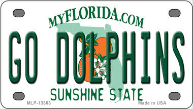 Go Dolphins Florida Novelty Mini Metal License Plate Tag. 2.2" x 4" high gloss novelty mini metal license plate tag. Made of the highest quality aluminum for a weather resistant finish. It is lightweight and durable. Pre-drilled holes for quick and easy mounting on any vehicle, or add a ribbon, wire or string to instantly turn this license plate into a sign and display it on a wall or door. Individually shrink-wrapped and proudly made in the USA.
