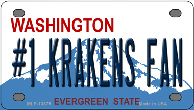 Number 1 Krakens Fan Washington Novelty Mini Metal License Plate Tag. 2.2" x 4" high gloss novelty mini metal license plate tag. Made of the highest quality aluminum for a weather resistant finish. It is lightweight and durable. Pre-drilled holes for quick and easy mounting on any vehicle, or add a ribbon, wire or string to instantly turn this license plate into a sign and display it on a wall or door. Individually shrink-wrapped and proudly made in the USA.