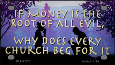 Money Is Root Of All Evil Novelty Mini Metal License Plate Tag. 2.2" x 4" high gloss novelty mini metal license plate tag. Made of the highest quality aluminum for a weather resistant finish. It is lightweight and durable. Pre-drilled holes for quick and easy mounting on any vehicle, or add a ribbon, wire or string to instantly turn this license plate into a sign and display it on a wall or door. Individually shrink-wrapped and proudly made in the USA.