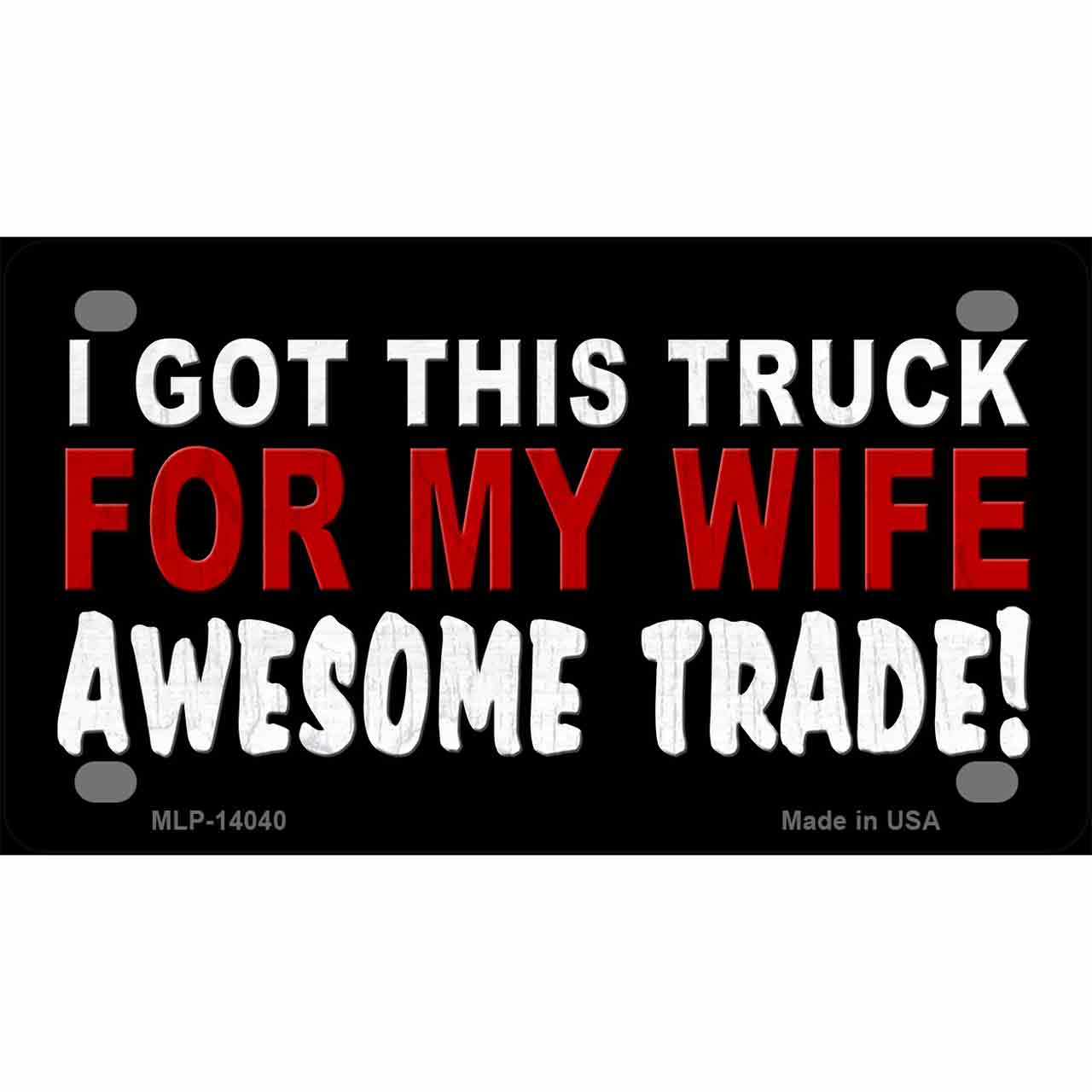 Trade Truck For My Wife Novelty Mini Metal License Plate. 2.2" x 4" high gloss Novelty Mini Metal License Plate Tag. Made of the highest quality aluminum for a weather resistant finish. It is lightweight and durable. Pre-drilled holes for quick and easy mounting on any vehicle, or add a ribbon, wire, or string to instantly turn this license plate into a sign and display it on a wall or door. Individually shrink-wrapped and proudly made in the USA.