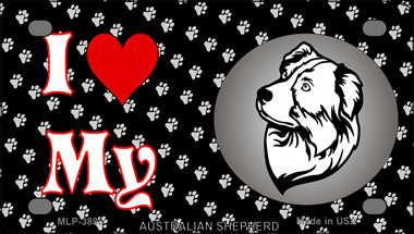 I Love My Australian Shepherd Novelty Mini Metal License Plate Tag. 2.2" x 4" high gloss novelty mini metal license plate tag. Made of the highest quality aluminum for a weather resistant finish. It is lightweight and durable. Pre-drilled holes for quick and easy mounting on any vehicle, or add a ribbon, wire or string to instantly turn this license plate into a sign and display it on a wall or door. Individually shrink-wrapped and proudly made in the USA.