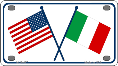 United States Italy Crossed Flags Novelty Mini Metal License Plate Tag. 2.2" x 4" high gloss novelty mini metal license plate tag. Made of the highest quality aluminum for a weather resistant finish. It is lightweight and durable. Pre-drilled holes for quick and easy mounting on any vehicle, or add a ribbon, wire or string to instantly turn this license plate into a sign and display it on a wall or door. Individually shrink-wrapped and proudly made in the USA.