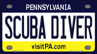 Scuba Diver Pennsylvania Novelty Mini Metal License Plate Tag. 2.2" x 4" high gloss novelty mini metal license plate tag. Made of the highest quality aluminum for a weather resistant finish. It is lightweight and durable. Pre-drilled holes for quick and easy mounting on any vehicle, or add a ribbon, wire or string to instantly turn this license plate into a sign and display it on a wall or door. Individually shrink-wrapped and proudly made in the USA.