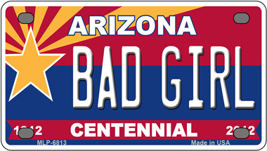 Bad Girl Arizona Centennial Novelty Mini Metal License Plate Tag. 2.2" x 4" high gloss novelty mini metal license plate tag. Made of the highest quality aluminum for a weather resistant finish. It is lightweight and durable. Pre-drilled holes for quick and easy mounting on any vehicle, or add a ribbon, wire or string to instantly turn this license plate into a sign and display it on a wall or door. Individually shrink-wrapped and proudly made in the USA.