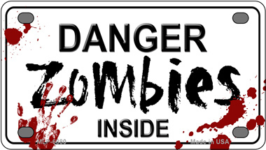 Danger Zombies Inside Novelty Mini Metal License Plate Tag. 2.2" x 4" high gloss novelty mini metal license plate tag. Made of the highest quality aluminum for a weather resistant finish. It is lightweight and durable. Pre-drilled holes for quick and easy mounting on any vehicle, or add a ribbon, wire or string to instantly turn this license plate into a sign and display it on a wall or door. Individually shrink-wrapped and proudly made in the USA.